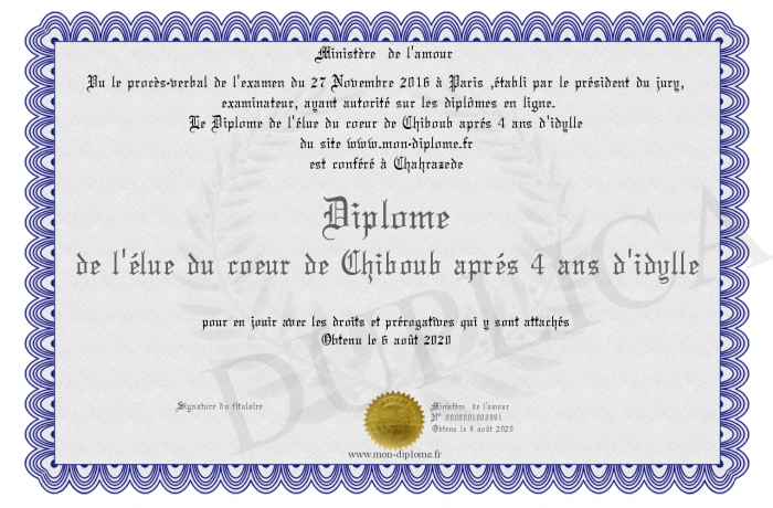Envoyez par email votre Diplôme de l'élue du coeur de Chiboub aprés 4 ans d'idylle personalisé