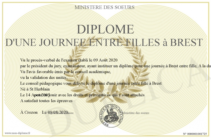 Envoyez par email votre Diplome d'une journée entre filles à Brest personalisé