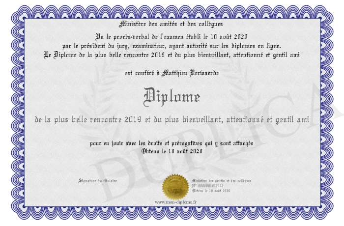 Envoyez par email votre Diplome de la plus belle rencontre 2019 et du plus bienveillant, attentionné et gentil ami personalisé