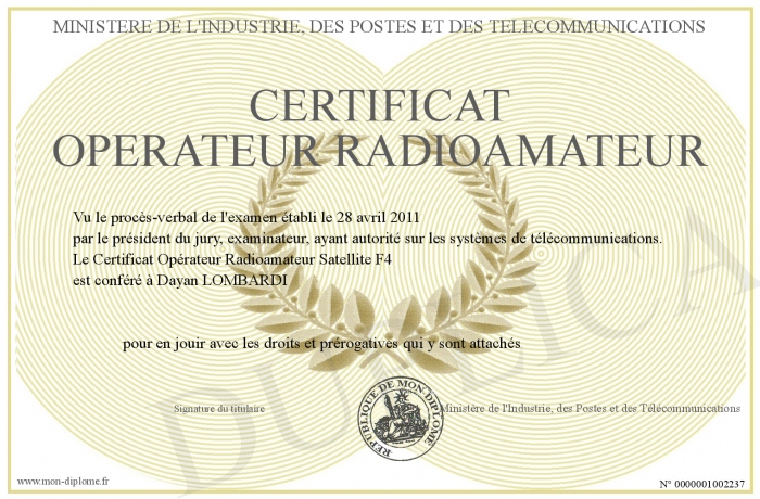 Envoyez par email votre Certificat Opérateur Radioamateur personalisé