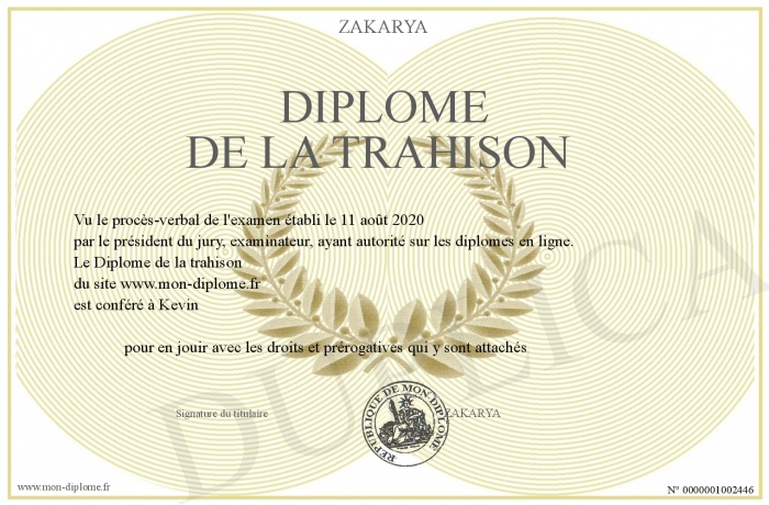 Envoyez par email votre Diplôme de la trahison personalisé