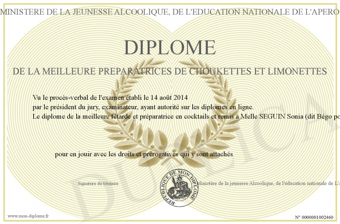 Envoyez par email votre Diplôme de la Meilleure Préparatrices de CHOUKETTES et LIMONETTES personalisé