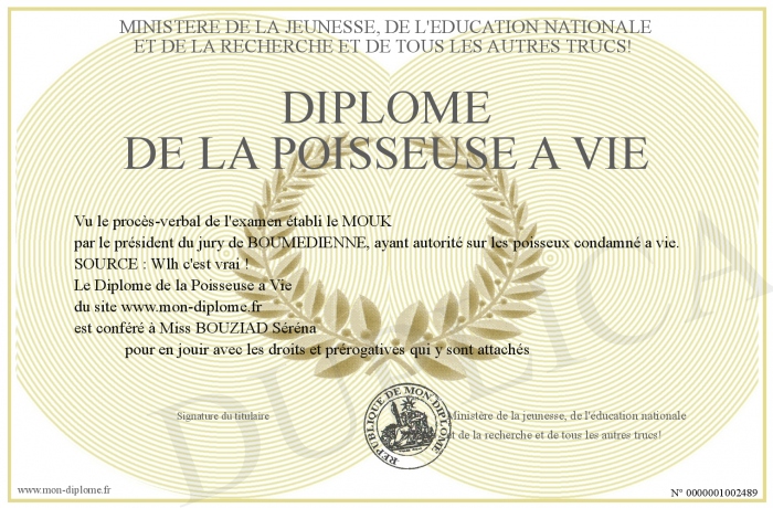 Envoyez par email votre Diplôme de la Poisseuse a Vie personalisé