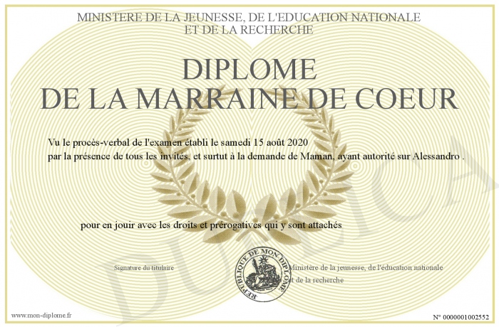 Envoyez par email votre Diplôme de la Marraine de coeur personalisé
