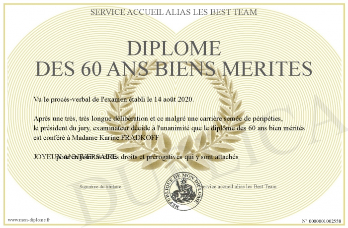 Envoyez par email votre Diplôme des 60 ans biens merités personalisé