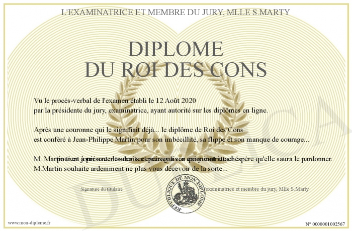 Envoyez par email votre Diplôme du Roi des Cons personalisé