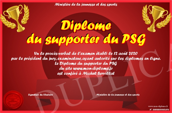 Envoyez par email votre Diplôme du supporter du PSG personalisé