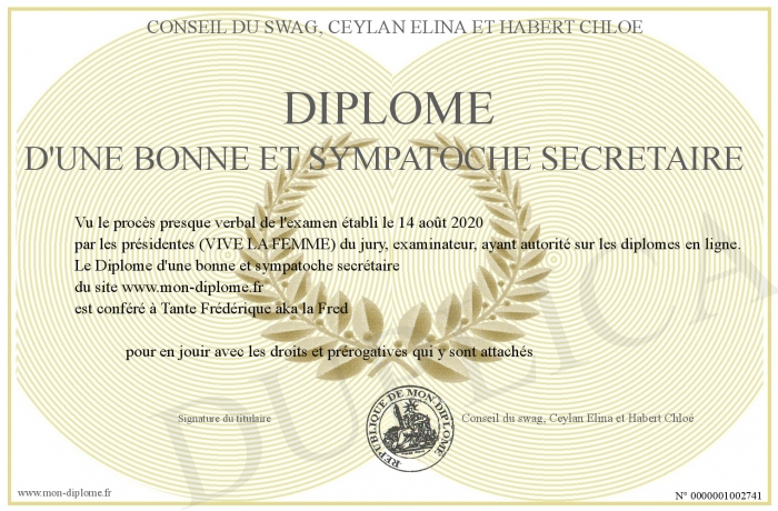 Envoyez par email votre Diplôme d'une bonne et sympatoche secrétaire personalisé