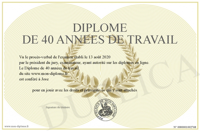 Envoyez par email votre Diplôme de 40 années de travail personalisé