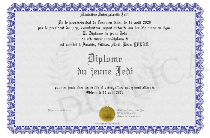 Envoyez par email votre Diplôme du jeune Jedi personalisé