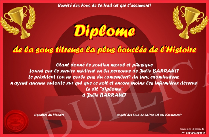 Envoyez par email votre Diplôme de la sous titreuse la plus bouclée de l'Histoire personalisé
