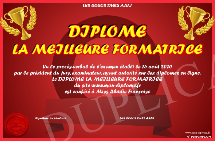 Envoyez par email votre DIPLOME LA MEILLEURE FORMATRICE personalisé