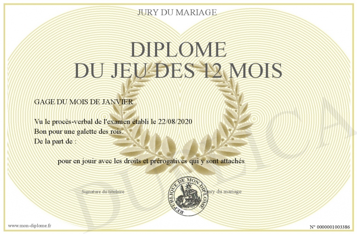 Envoyez par email votre Diplôme du jeu des 12 mois personalisé