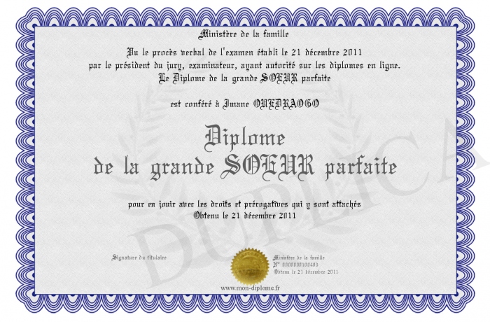 Envoyez par email votre Diplôme de la grande SOEUR parfaite personalisé