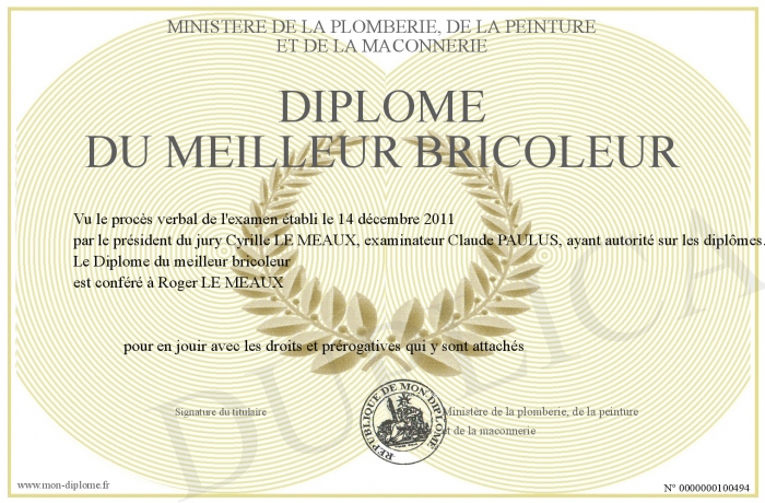 Envoyez par email votre Diplôme du meilleur bricoleur personalisé