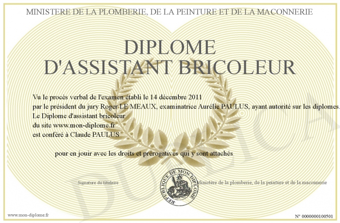 Envoyez par email votre Diplome d'assistant bricoleur personalisé