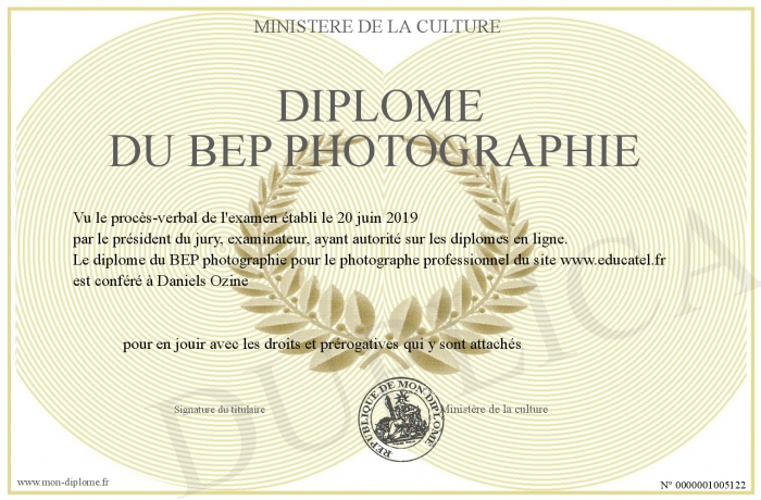 Envoyez par email votre Diplôme du BEP photographie personalisé
