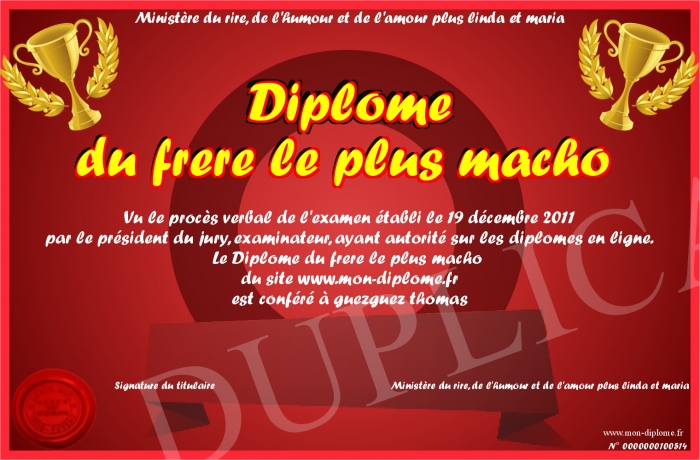 Envoyez par email votre Diplome du frere le plus macho personalisé