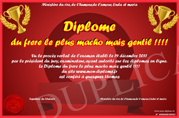 Envoyez par email votre Diplome du frere le plus macho mais gentil !!!! personalisé