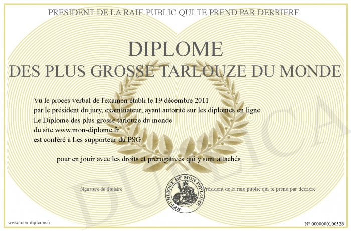 Envoyez par email votre Diplôme des plus grosse tarlouze du monde personalisé