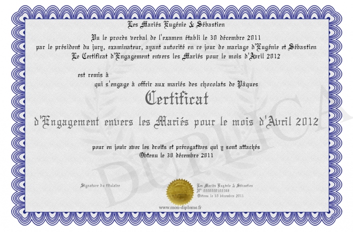 Envoyez par email votre Certificat d'Engagement envers les Mariés pour le mois d'Avril 2012 personalisé