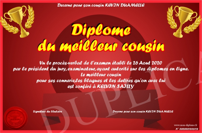 Envoyez par email votre Diplôme du meilleur cousin personalisé
