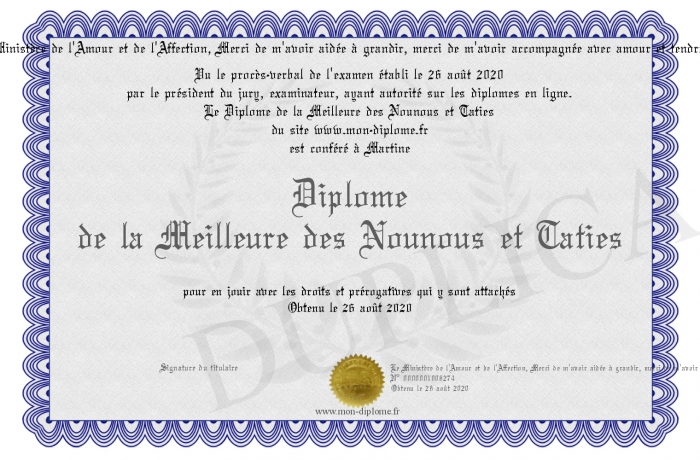 Envoyez par email votre Diplôme de la Meilleure des Nounous et Taties personalisé
