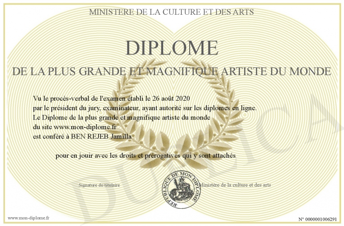 Envoyez par email votre Diplôme de la plus grande et magnifique artiste du monde personalisé