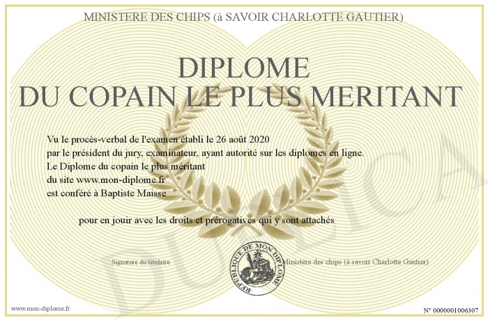 Envoyez par email votre Diplôme du copain le plus méritant personalisé