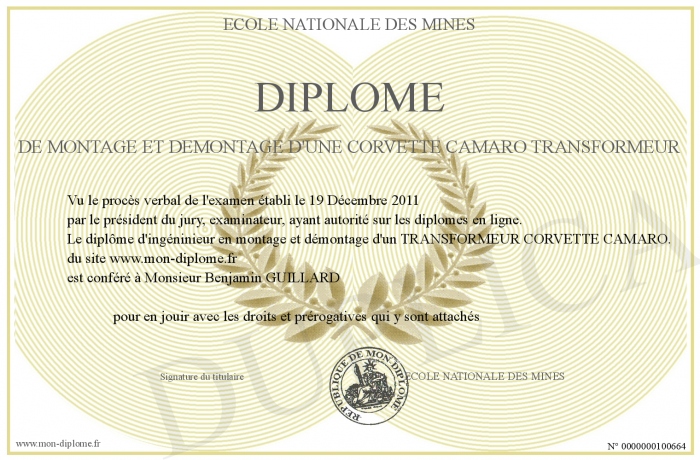 Envoyez par email votre Diplome de montage et démontage d'une Corvette CAMARO TRANSFORMEUR personalisé