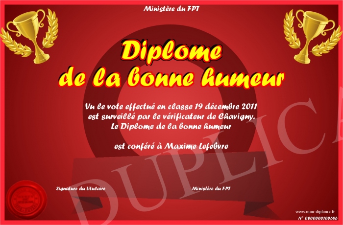 Envoyez par email votre Diplome de la bonne humeur personalisé