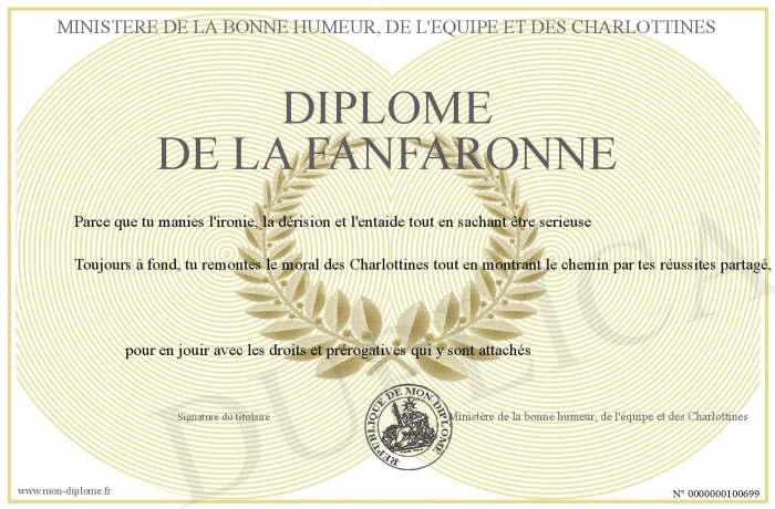 Envoyez par email votre Diplôme de la Fanfaronne personalisé