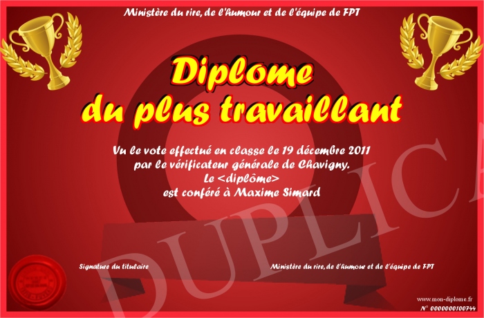 Envoyez par email votre Diplôme du plus travaillant personalisé