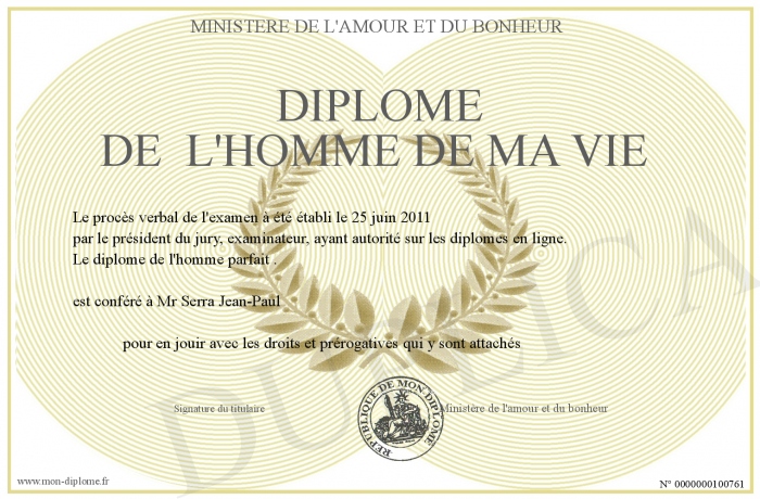 Envoyez par email votre Diplôme de l'homme de ma vie personalisé