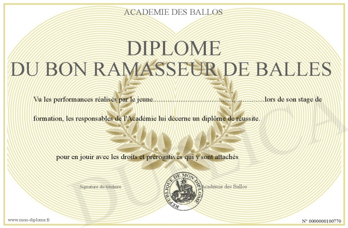 Envoyez par email votre Diplôme du bon ramasseur de balles personalisé