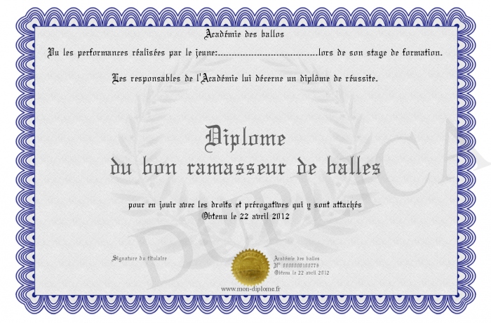 Envoyez par email votre Diplôme du bon ramasseur de balles personalisé