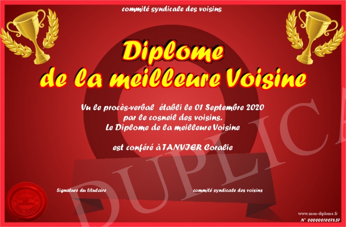 Envoyez par email votre Diplôme de la meilleure Voisine personalisé
