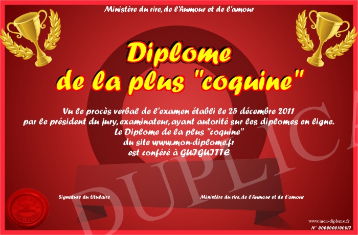 Envoyez par email votre Diplome de la plus -coquine- personalisé