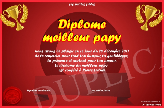 Envoyez par email votre Diplôme meilleur papy personalisé