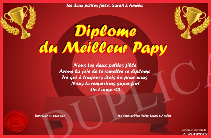 Envoyez par email votre Diplôme du Meilleur Papy personalisé