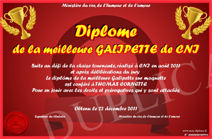 Envoyez par email votre Diplôme de la meilleure GALIPETTE de CNI personalisé