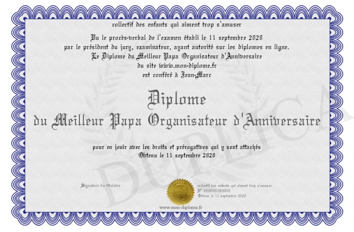 Envoyez par email votre Diplôme du Meilleur Papa Organisateur d'Anniversaire personalisé