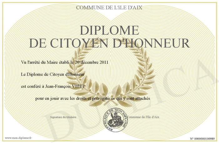 Envoyez par email votre Diplôme de Citoyen d'Honneur personalisé
