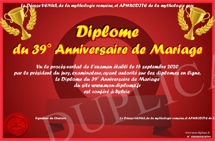 Envoyez par email votre Diplôme du 39° Anniversaire de Mariage personalisé