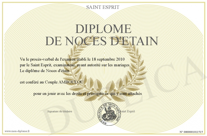 Envoyez par email votre Diplôme de Noces d'étain personalisé
