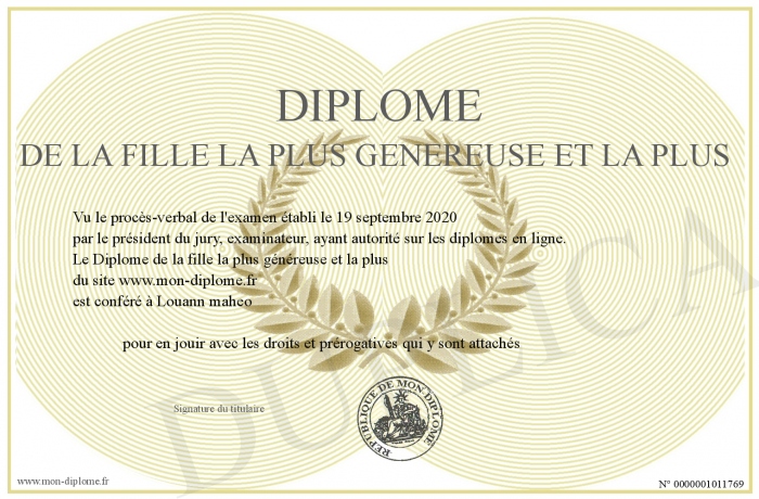 Envoyez par email votre Diplome de la fille la plus généreuse et la plus personalisé
