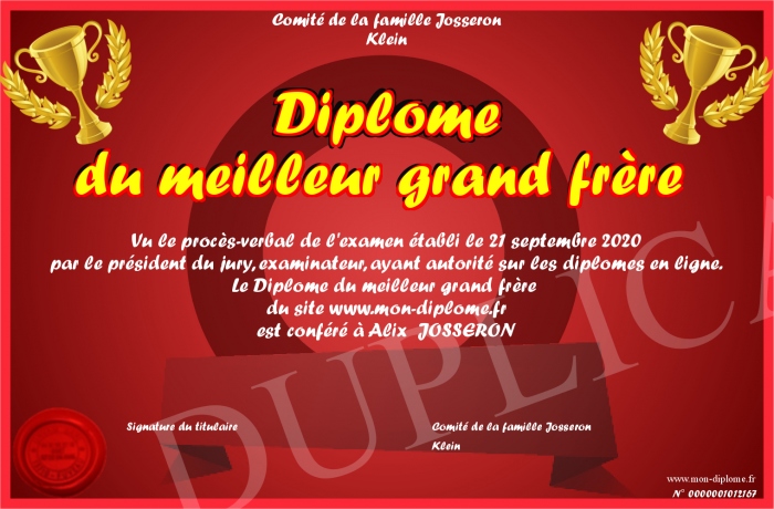 Envoyez par email votre Diplôme du meilleur grand frère personalisé