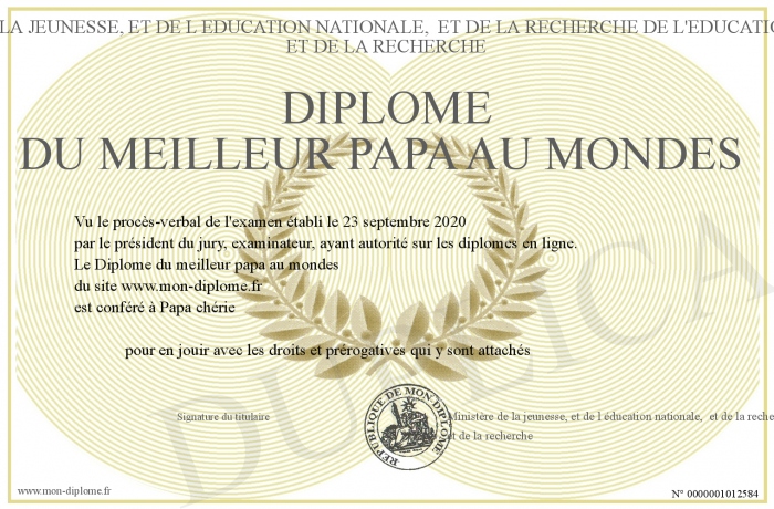 Envoyez par email votre Diplôme du meilleur papa au mondes personalisé