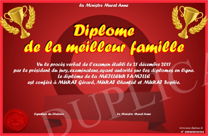Envoyez par email votre Diplôme de la meilleur famille personalisé