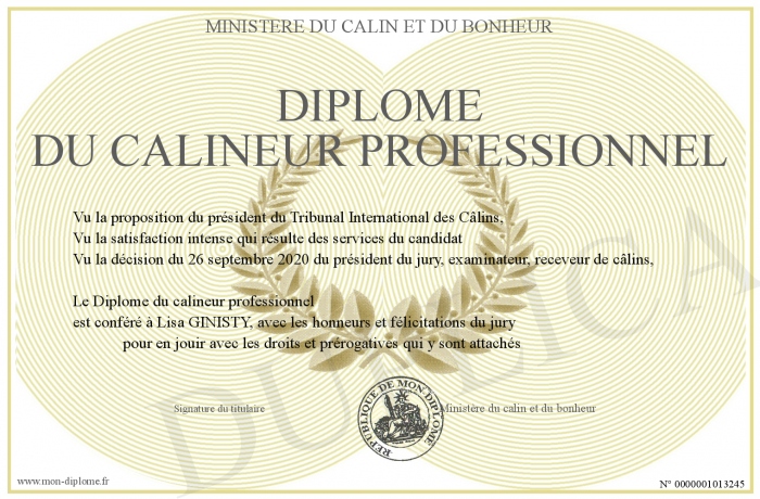 Envoyez par email votre Diplôme du calineur professionnel personalisé